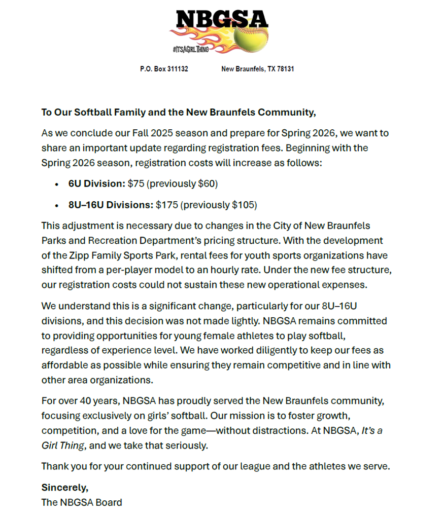 New Braunfels Girls Softball Association is proud to be the only all-girls, all-softball league in New Braunfels. We play our home games at Camp Comal and love softball. We can't wait to meet your daughter and help develop her skills and love of softball.